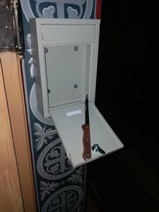 Persoanele care au descoperit furtul au spus că hoții au furat banii din cutia milei și au lăsat în locul lor un cuțit. (Sursa foto: Facebook)