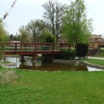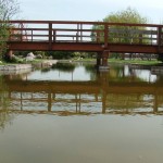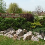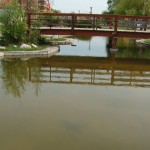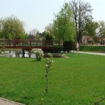 – Un bazin ornamental central reprezintă cel de al treilea element, care, datorită formei neregulate, existenţei stâncăriilor şi a unui pod de trecere din lemn, dă senzaţia de lac natural.