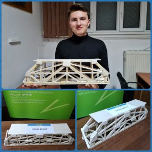 Echipa „BUILT TO LAST” –Robert-Cătălin Eppel, anul III, secția Inginerie Civilă. Studentul a câștigat mențiune specială pentru „frumusețea machetei – secțiunea Poduri”.