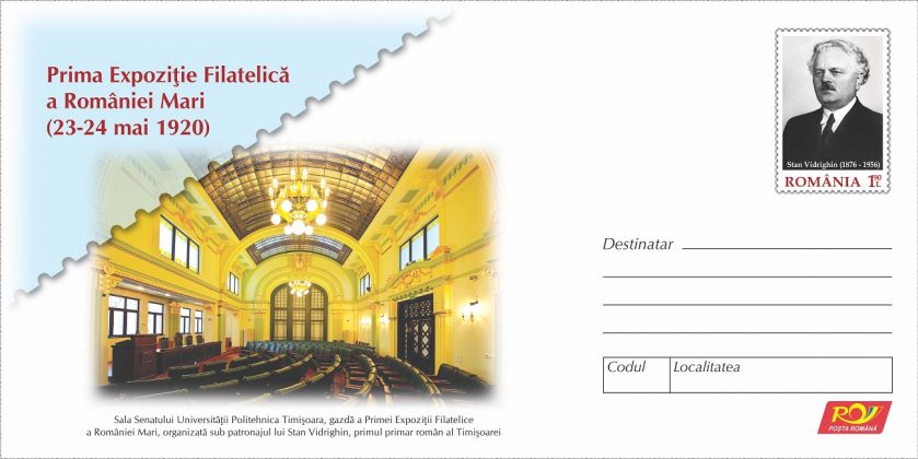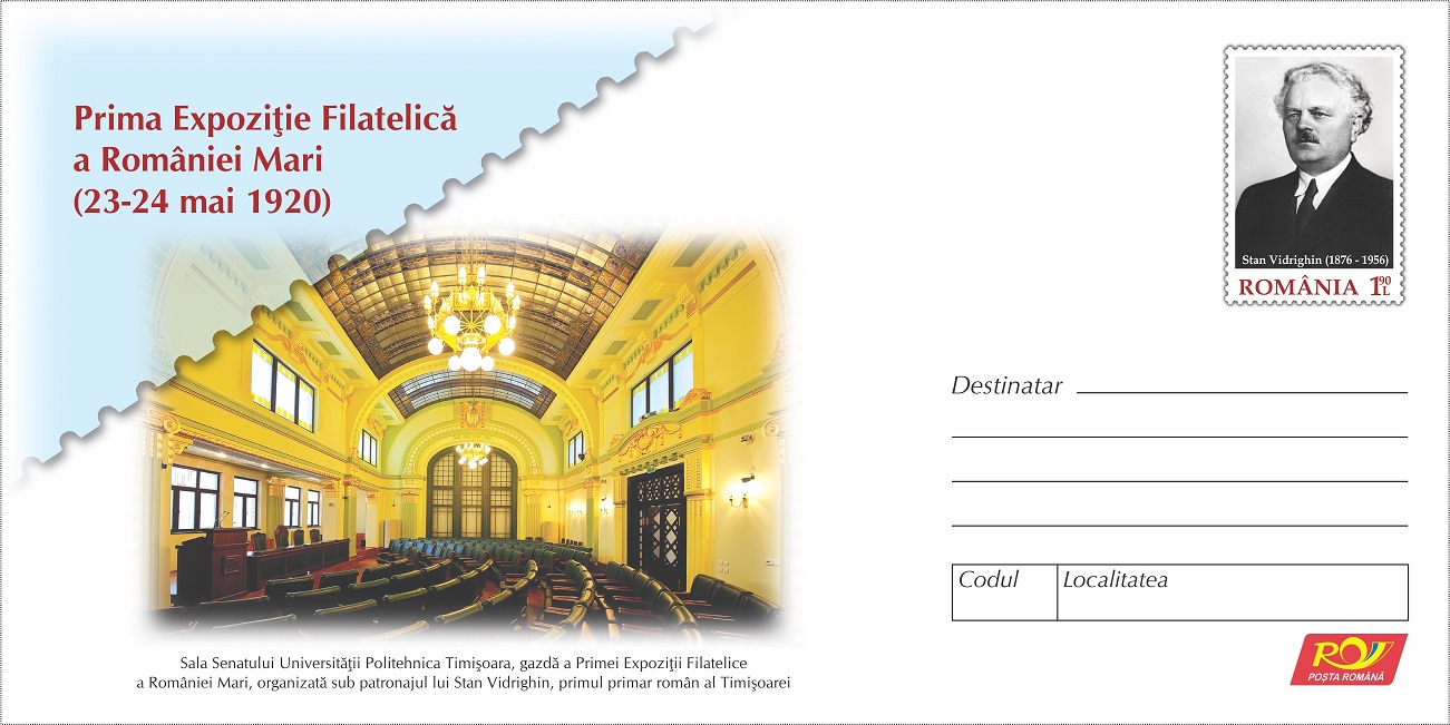 În urmă cu 100 de ani, la 23-24 mai 1920, în Palatul Lloyd, în actuala Sală a Senatului Universității Politehnica Timișoara, a fost organizată prima expoziție filatelică din România Mare. Din catalogul expoziţiei reiese că aceasta a fost patronată de Stan Vidrighin, pe atunci primar, iar ulterior rector al Politehnicii timișorene.