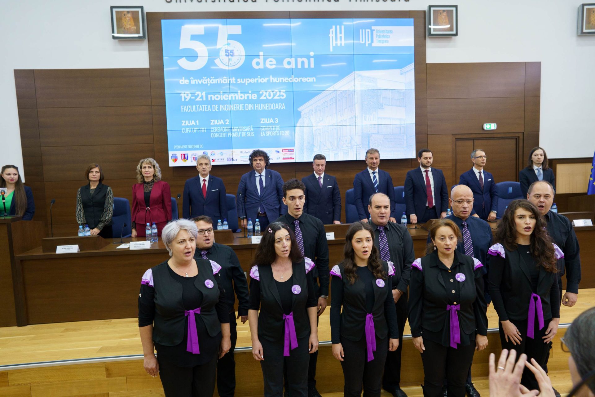 Cea de-a doua zi a reprezentat momentul central al aniversării, ceremonia desfășurându-se într-o atmosferă solemnă și festivă. Evenimentul a început cu un moment de reculegere în memoria cadrelor didactice care au pus bazele învățământului superior hunedorean și care nu mai sunt alături de noi, dar rămân înscrise pentru totdeauna în istoria facultății. Corul UPT a interpretat imnul academic Gaudeamus Igitur, marcând deschiderea oficială.