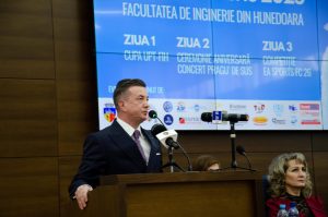 Conf. univ. ec. dr. ing. Gelu Ovidiu Tirian, decanul Facultății de Inginerie din Hunedoara, a deschis seria discursurilor. Acesta a vorbit despre rolul decisiv al Universității Politehnica Timișoara în transformarea Hunedoarei într-un oraș universitar, despre evoluția facultății și despre ceea ce reprezintă astăzi: peste 700 de studenți pregătiți în domenii de vârf, laboratoare moderne, programe de studiu actualizate și relații puternice cu industria și cu mediul preuniversitar.