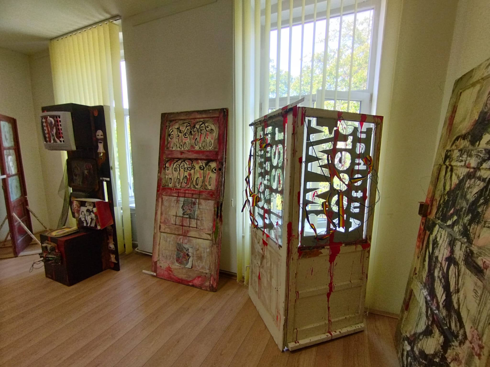 Lucrările sunt diverse, predomină nuanțele de roșu, gri, negru și argintiu. În cadrul lucrărilor sunt incorporate oglinzi, dar și un televizoare alb-negru. Unele dintre uși au și gratii. Una dintre lucrări are conține o incoană, dar și un buchet confecționat din ziarele vremii, legat cu panglică roșie.