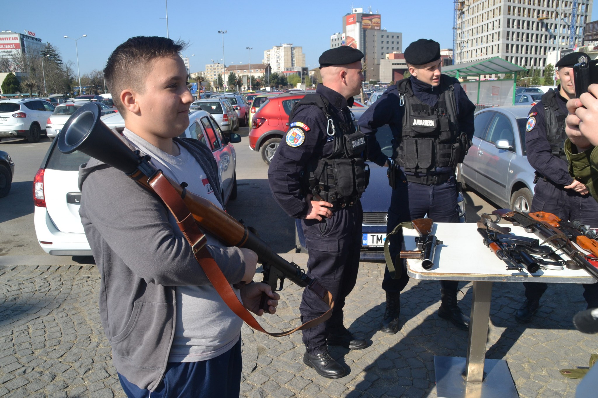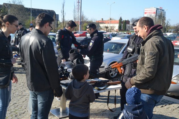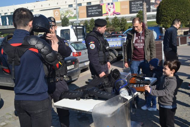 Mare bucurie pe copii! Au putut vedea și pipăi de aproape arme, câini, mașini uniforme, căști sau scuturi. Ce poate fi mai interesant decât să încerci cum îți vine o cască de apărare? A fost o frenezie de nedescris. S-a stat la coadă pentru a urca la volanul câte unui autovehicul albastru și să claxoneze fără oprire. Au aflat repede de unde se pornește sirena și apoi să te ții hărmălaie continuă!