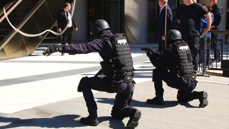 Pe la prânz a început nebunia. Un grup de răufăcători au vrut să atace centrul comercial. Nu au avut nici o șansă. Au fost anihilați, împușcați, gazați, lătrați, arestați, certați, amendați și încătușați cât ai spune „Șo pe ei”. Câinii de serviciu care au stat liniștiți și plictisiți până atunci, ca niște animale de pluș, au devenit fiare și au reținut infractorii. Probabil nu vor mai încerca niciodată să mai încalce legea. Până la demonstrația de anul viitor.