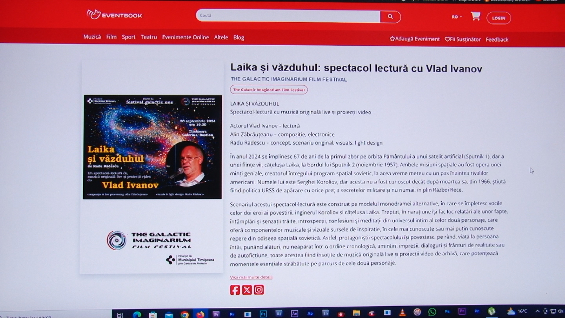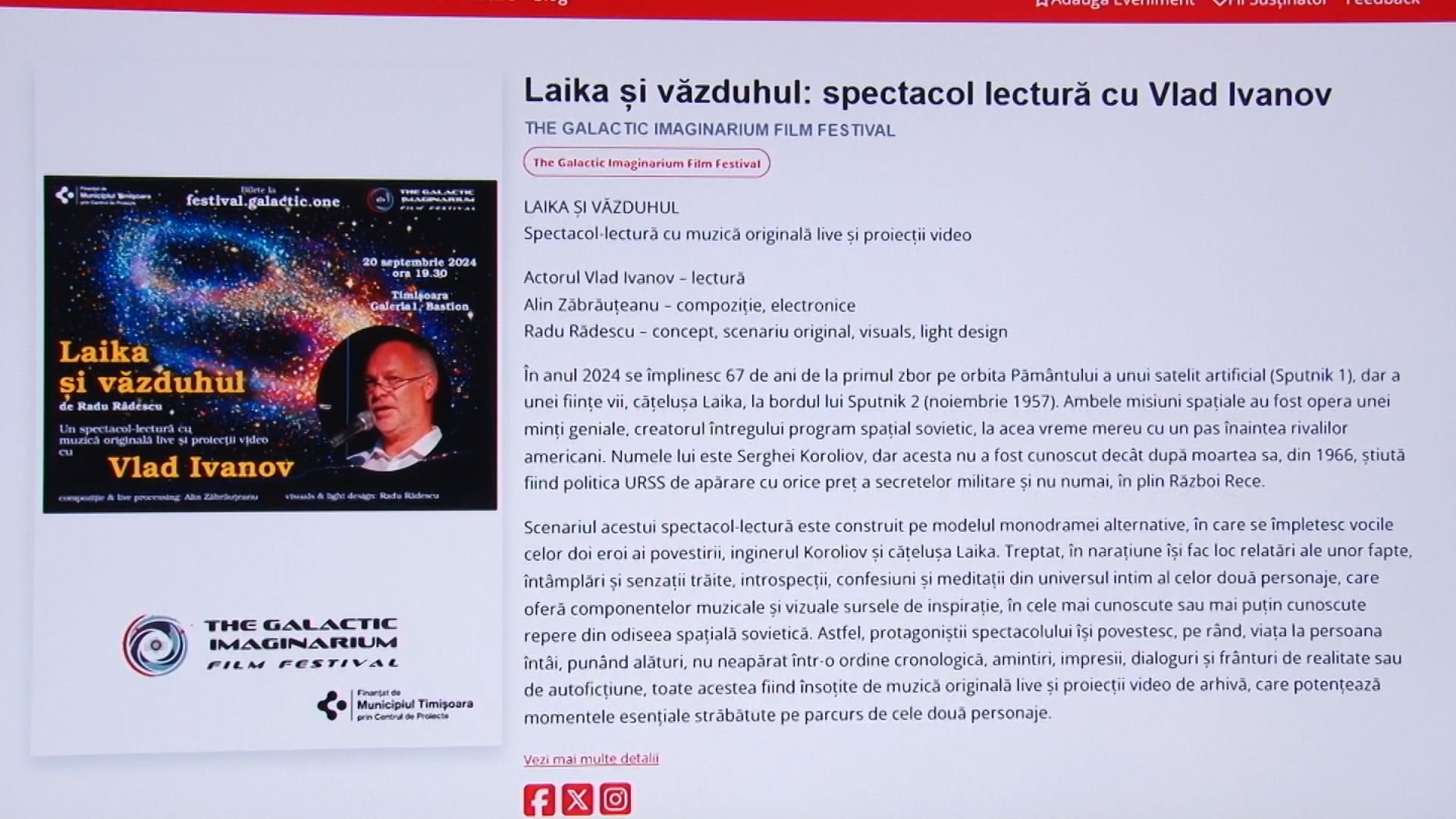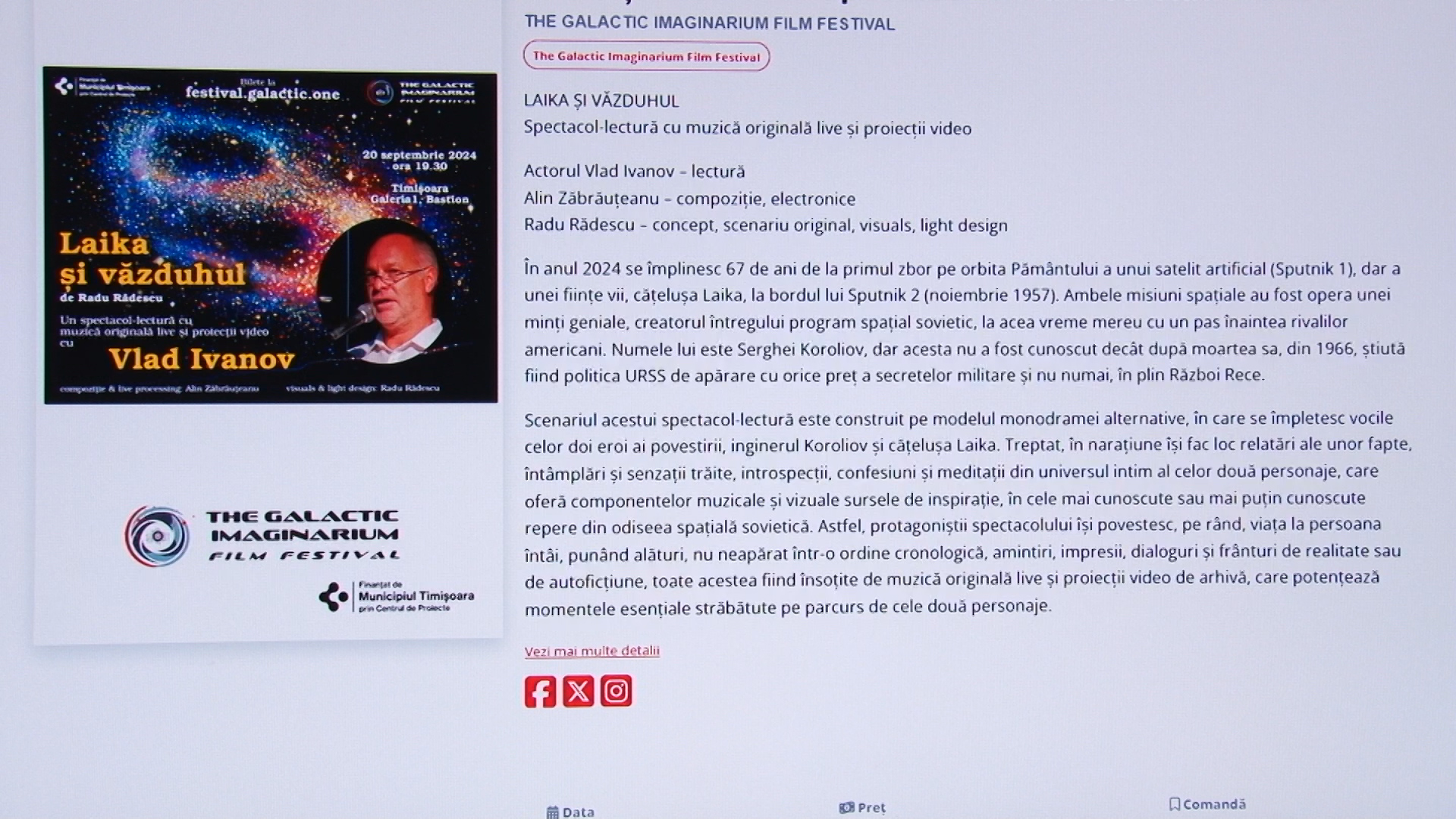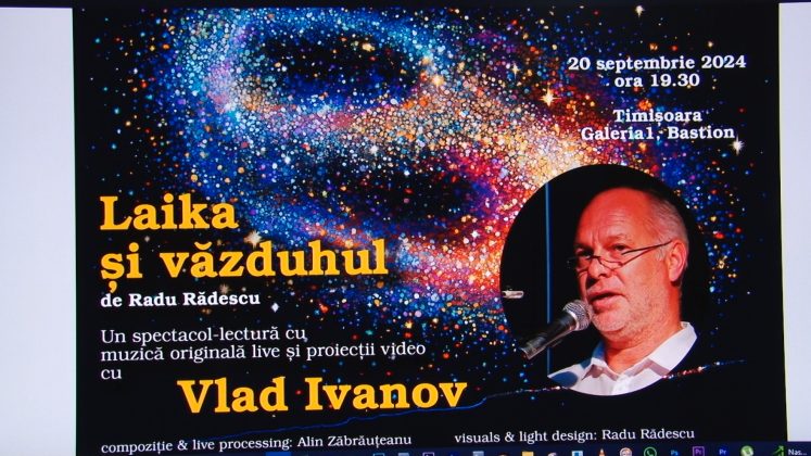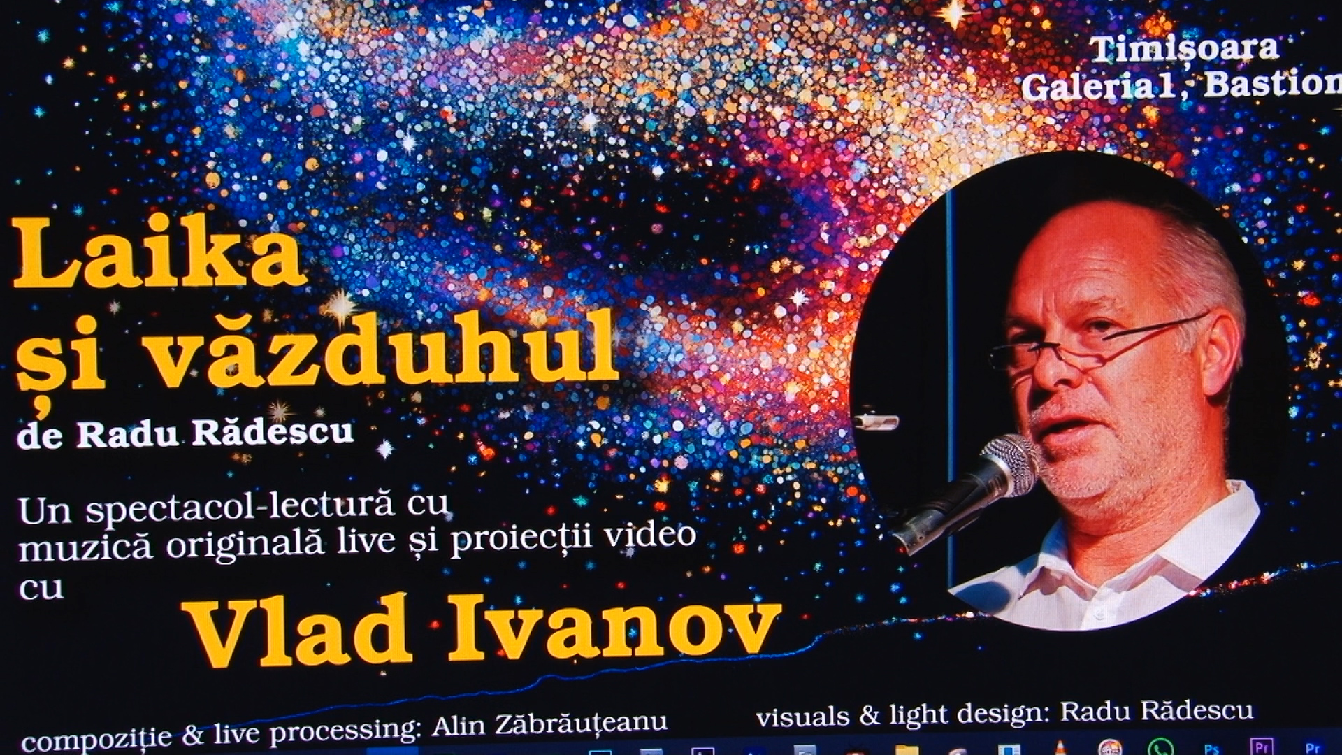 Spectacolul-lectură „Laika și văzduhul”, de Radu Rădescu, cu actorul Vlad Ivanov, visual & light design Radu Rădescu, compoziție & live processing Alin Zăbrăuțeanu (20 septembrie). Biletele sunt disponibile la adresa festival.galactic.one/ro/magazin