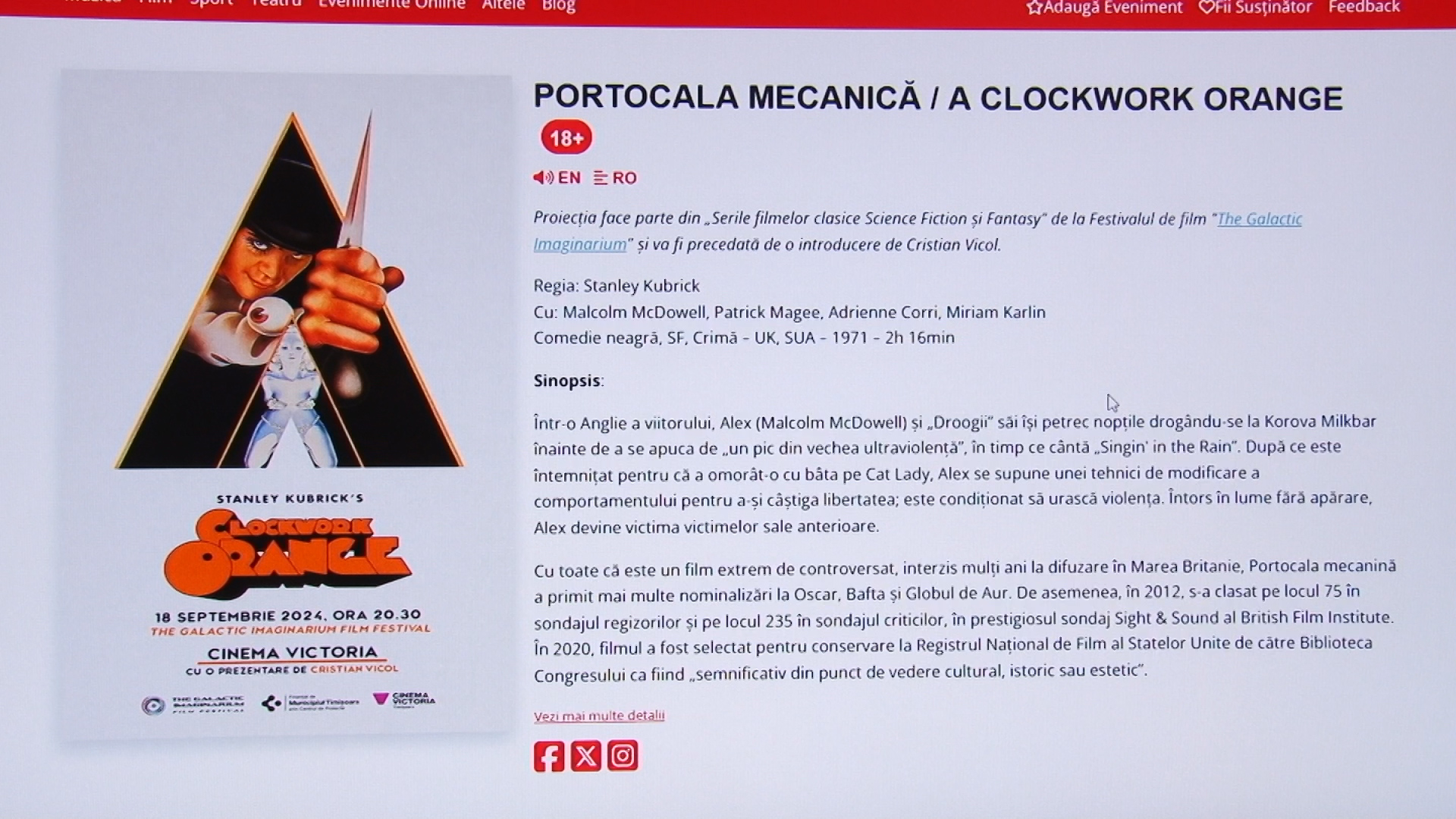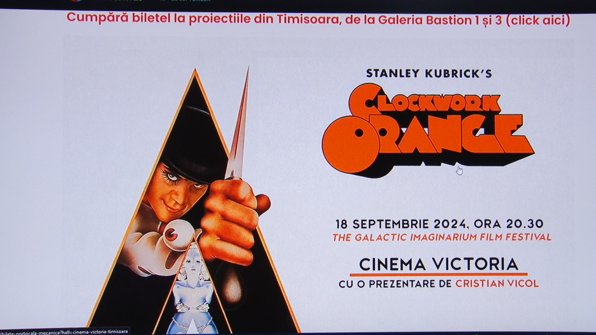 Cinema Victoria (18 septembrie) în cadrul Cinematecii clasice de film Science Fiction și Fantasy, cu filmul „Portocala mecanică” (1973) în regia lui Stanley Kubrick. Prezentarea filmului va fi realizată de Cristian Vicol.
