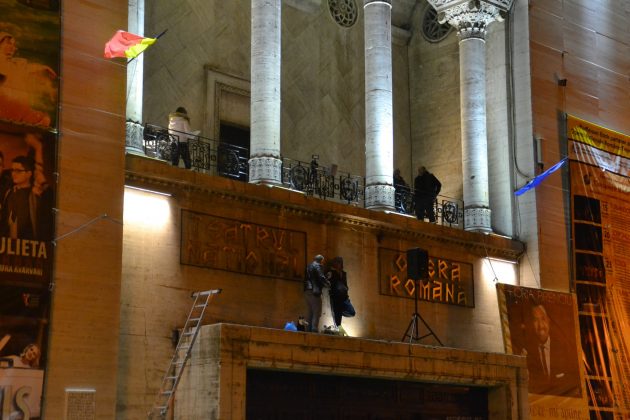 La balconul Operei Naționale au urcat câțiva dintre organizatorii protestului, în frunte cu Cristi Brâncovan, cunoscutul timișorean.