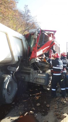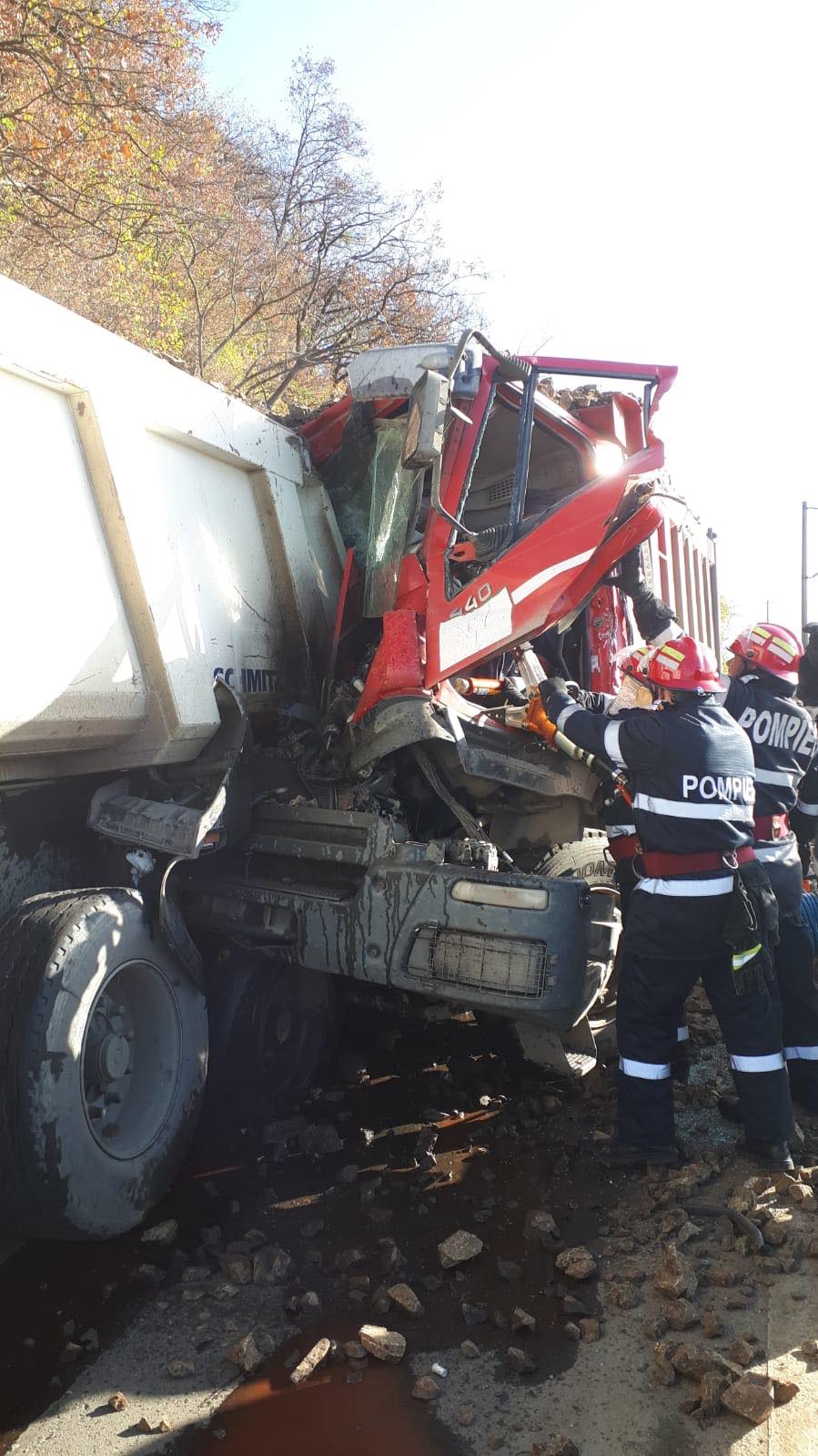 Au fost implicate două camioane, ambele încărcate cu piatră. În urma accidentului, o persoană a fost rănită. Are o plagă la picior și pompierii au reușit să o scoată din camionul avariat.