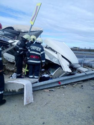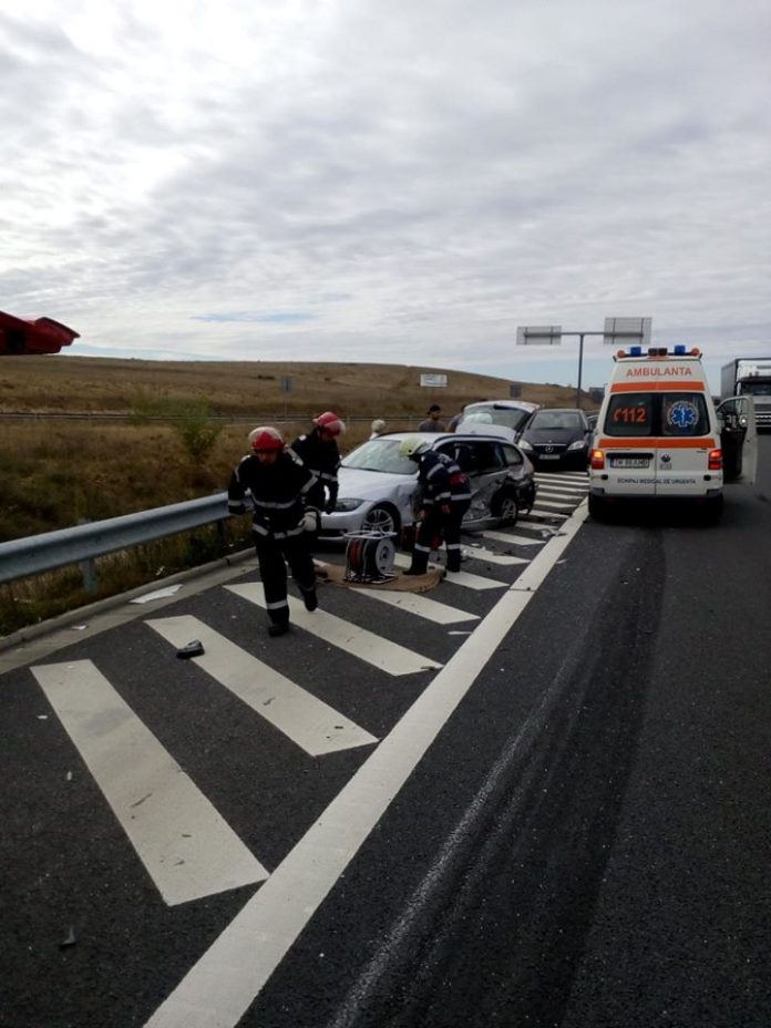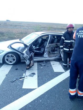 „ISU Timiș a fost solicitat să intervină la un accident rutier la ieșirea de pe autostrada A1 spre Traian Vuia, sensul de mers Lugoj-Deva. La locul intervenției s-au deplasat două autospeciale de stingere cu modul de descarcerare, un echipaj SMURD, un ofițer și 15 subofițeri, ambulanță SAJ și echipaj de poliție”, spun pompierii.