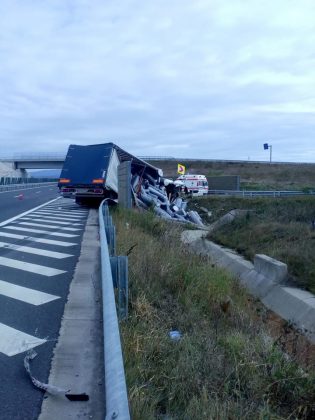 Un TIR încărcat cu materiale textile s-a lovit de un autourism chiar la urcarea pe autostrada A1, la nodul rutier de lângă localitatea Train Vuia. În urma impactului, parapetul de pe marginea șoselei a fost distrus și încărcătură camionului s-a răsturnat în șanț.