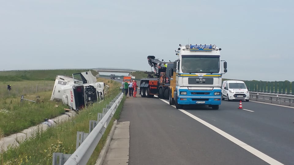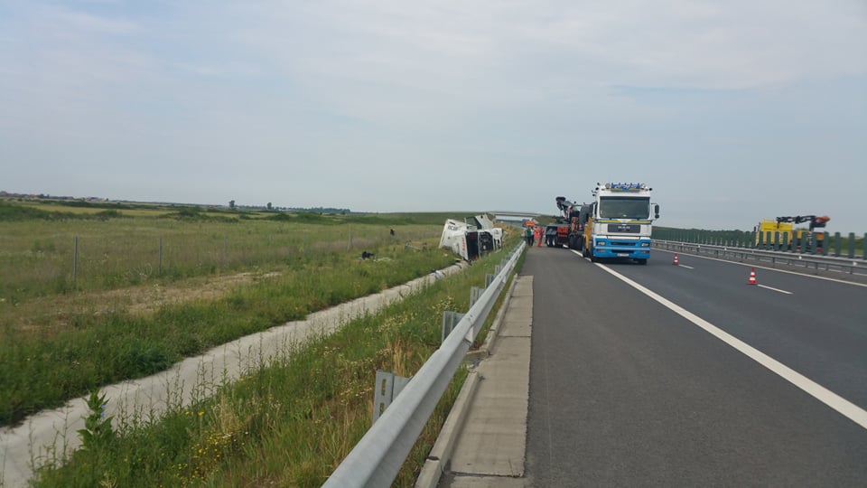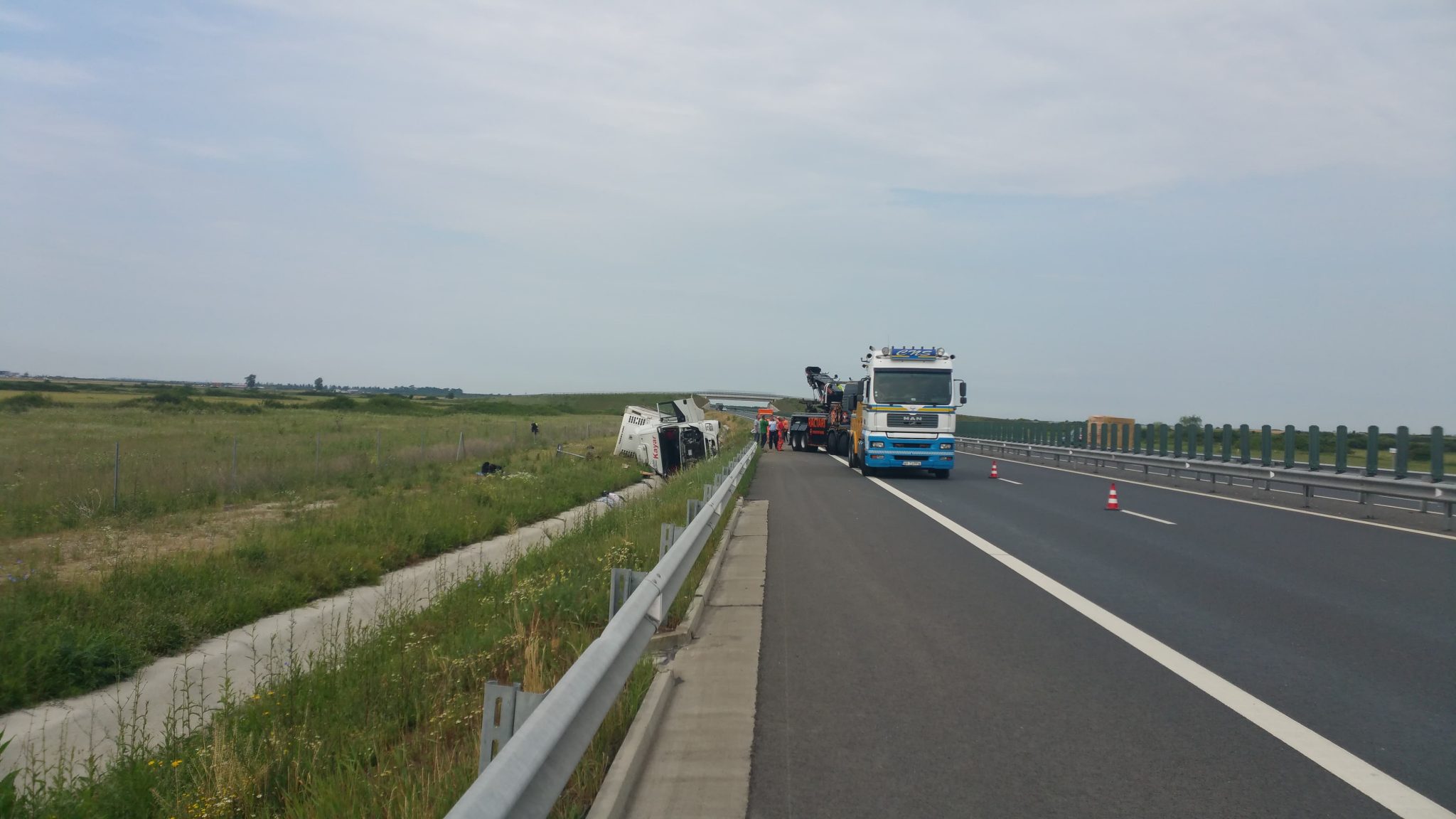 Un accident grav a avut loc, luni dimineață, pe autostrada A1, între Timișoara și Lugoj. Un TIR a ieșit de pe șoseaua de mare viteză, a trecut prin parapet și apoi s-a răsturnat în șanț.