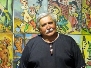 Peste un timp, în vizită fiind la profesorul și pictorul Ioan Perciun, am descoperit, într-o mapă pe care gazda mea o pusese pe masă spre cercetare, un set de desene alb-negru care m-a făcut să scot exclamații de entuziasm. Îl știi? E Sax, am răspuns fără să clipesc. El era și era formidabil! În 2018, scriitoarea Adriana Cârcu a organizat, în curtea casei ei de vacanță de la Ciclova, o expoziție cu câteva picturi ale artistului trăitor, ca și Adriana, în Germania. Nu doar pentru mine — prezent acolo — a fost o experiență vizuală amețitoare și uluitoare, ci și pentru mâna de curioși care au bătut amar de drum (și nu distanța ar fi problema, ci puzderia de gropi) până în localitatea cărășană. Motivați și de succesul pe care pictura lui Sax Moradi l-a avut la acea expoziție „de curte”, am hotărât să facem una mare și tare în Timișoara. Iar Călin Petcana, inimosul și inteligentul manager al Galeriei Calpe, a zis da când i-am făcut propunerea și i-am argumentat-o verbal și vizual.
