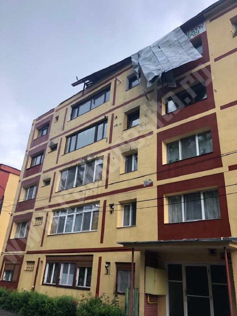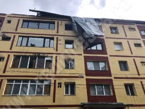 Este vorba despre imobilul de pe strada Petru Maior 75. Bucăţile de acoperiş au avariat şi câteva dintre maşinile parcate în faţa blocului.