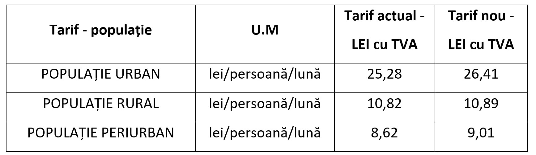 - Pentru populație – tarife exprimate în lei cu TVA