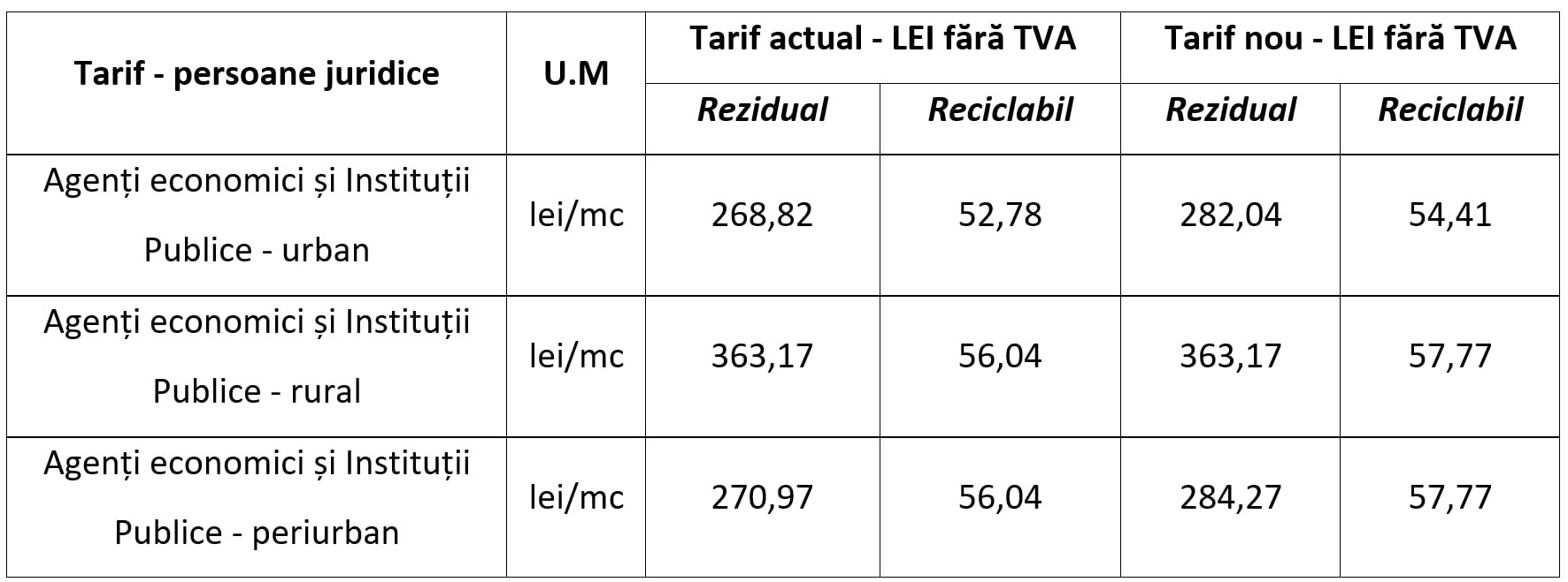 - Pentru persoane juridice – tarife exprimate în lei fără TVA