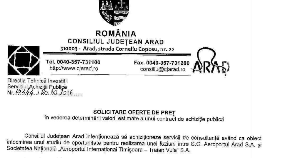 Potrivit criticarad.ro, CJ Arad încă nu știe cât să ceară pe el, așa încât vrea oferte de preţ în vederea determinării valorii estimate a unui contract de achiziţie publică având ca obiect: „Servicii de consultanţă în vederea întocmirii unui studiu de oportunitate pentru realizarea unei fuziuni între S.C. Aeroportul Arad S.A. şi Societatea Naţională „Aeroportul Internaţional Timişoara – Traian Vuia” S.A.