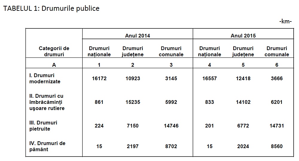 În ceea ce priveşte starea tehnică a drumurilor publice, 41,5% din lungimea drumurilor modernizate şi 51,2% din lungimea drumurilor cu îmbrăcăminţi uşoare rutiere aveau durata de serviciu depăşită.