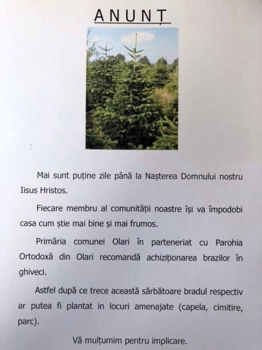 „Mai sunt puţine zile până la Naşterea Domnului Nostru Iisus Hristos. Fiecare membru al comunităţii noastre îşi va împodobi casa cum ştie mai bine şi mai frumos. Primăria Comunei Olari în parteneriat cu Parohia Ortodoxă din Olari recomandă achiziţionarea brazilor în ghiveci. Astfel, după ce trece această sărbătoare, bradul respectiv ar putea fi plantat în locuri amenajate (capelă, cimitire, parc etc.). Vă mulţumim pentru implicare“, se arată în apel.