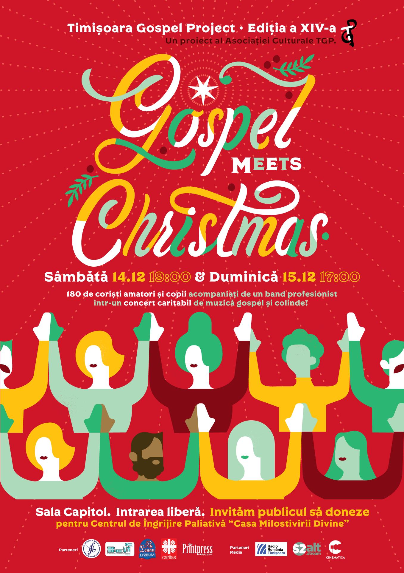 Sub bagheta magică a dirijorului Dominic Samuel Fritz, „Gospel Meets Christmas” va răsuna sâmbătă, 14 decembrie la ora 19 şi duminică, 15 decembrie la ora 17, la sala Capitol a Filarmonicii Banatul din Timișoara. Intrarea este liberă. La final, se pot face donații pentru Centrul de Îngrijire Paliativă de tip Hospice „Casa Milostivirii Divine”.
