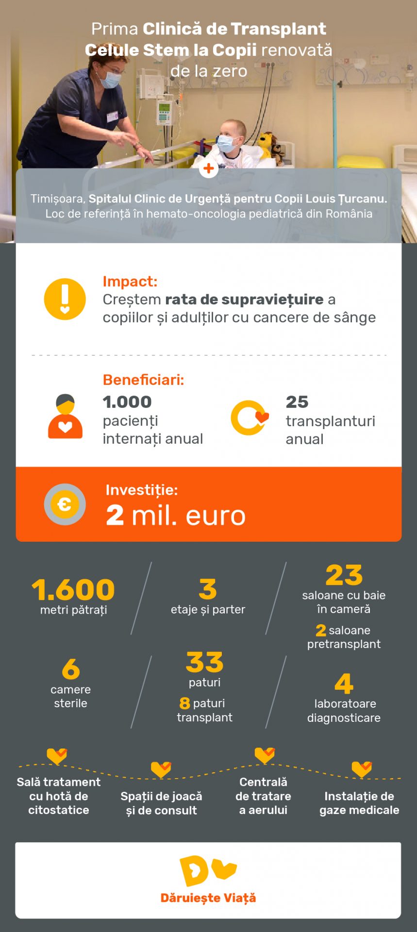 Pacienții au acces la cameră de joacă, la tehnologie și la un ambient plăcut în care își pot continua copilăria cât timp luptă cu boala. În plus, cadrele medicale, beneficiază de spații adecvate de consult și desfășurare activități zilnice. Acest proiect strategic se alătură celorlalte inițiative Dăruiește Viață de schimbare radicală a sistemului medical de sănătate din România în beneficiul pacienților și al cadrelor medicale, alături de construcția Primului Spital Național de Copii pentru Cancer, Boli Grave și Traumă (inițiativa #NoiFacemUnSpital).