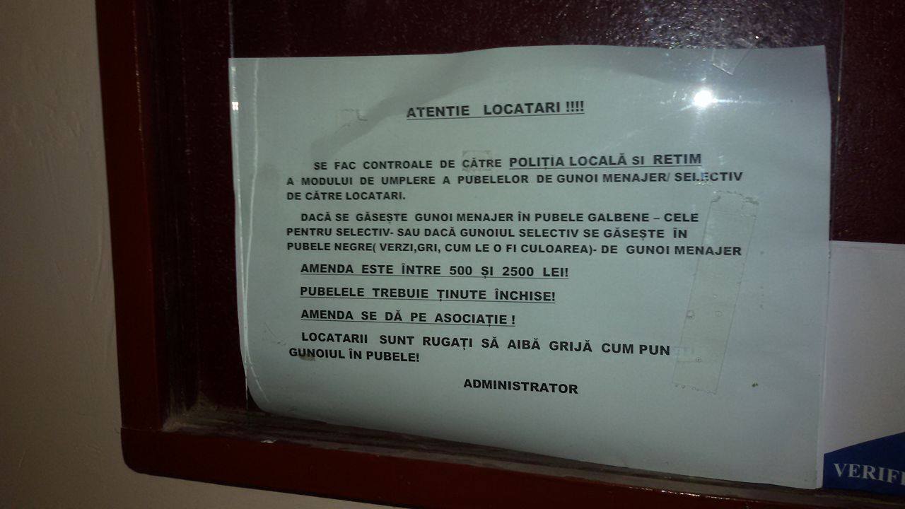 Mai mulți administratori au afișat deja anunțuri conform cărora: ”Se fac controale de Poliția Locală și RETIM a modului de umplere a pubelelor de gunoi menajer/selectiv de către locatari. Dacă se găsește gunoi menajer în pubelele galbene – cele pentru selectiv – sau dacă gunoiul selectiv se găsește în pubelele negre (verzi, gri sau cum le-o fi culoarea) de gunoi menajer.