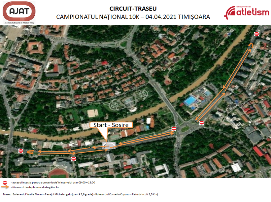 Campionatul Național de 10 kimoletri, finala pentru seniori U23 și juniori I are loc, duminică, la Timișoara, motiv pentru care traficul în zona centrală va fi închis pentru un anumit interval orar.