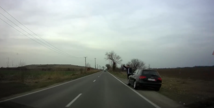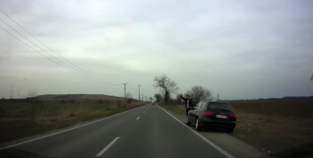 „Atenție!!! SPRE ȘAG LA BIFURCAȚIE PARȚA. Acest individ pretinde că are nevoie de bani pentru benzină (că și-a pierdut portofelul), pretinde că este arab și se îndreaptă spre Serbia unde lucrează, vorbește bine limba engleză”, a scris șoferul care l-a filmat.