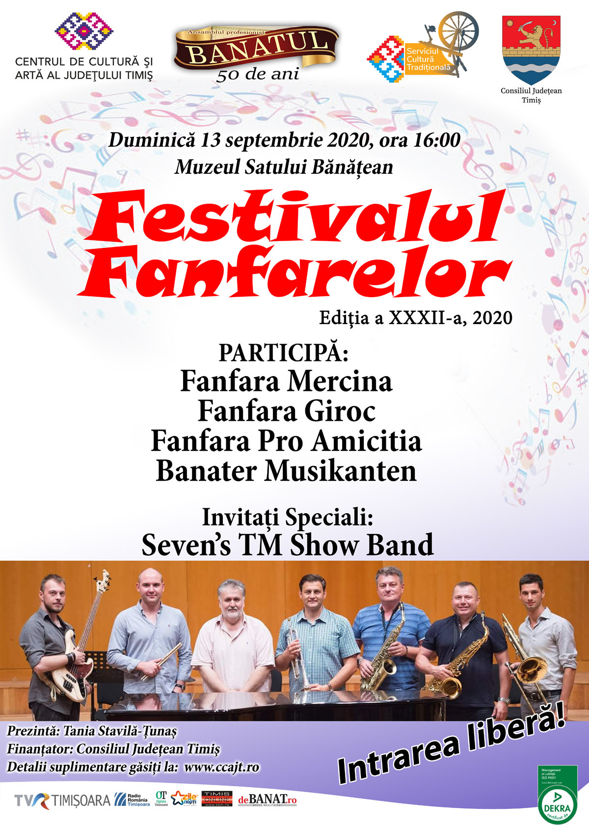 Într-un alt mod decât cel cu care am fost obișnuiți, adaptat condițiilor speciale ale acestei perioade, dar la fel de captivant și plin de farmec, Festivalul Fanfarelor se va desfășura în acest sfârșit de săptămână, la Muzeul Satului Bănățean. Azi, 13 septembrie 2020, de la ora 16, atmosfera tradițională a Banatului de altădată va fi recreată muzical de 5 fanfare din zona de vest a țării.