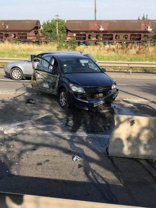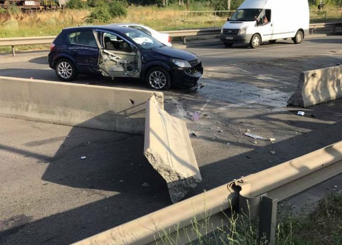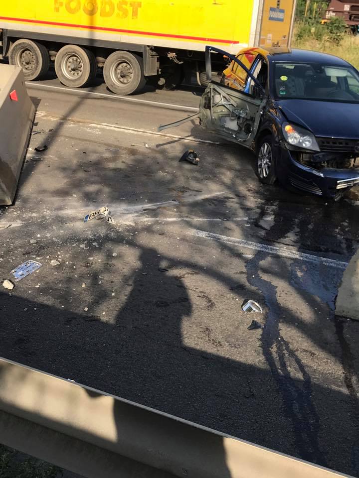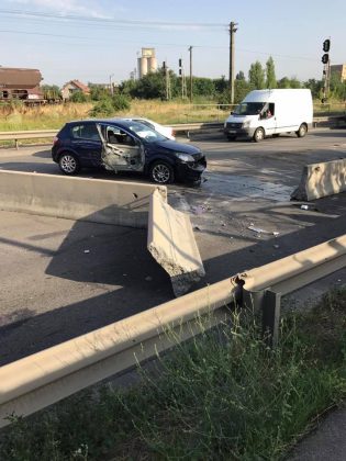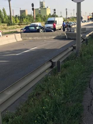 Din impact, parapeţii New Jersey care delimitează cele două sensuri de mers, au fost mutaţi câţiva metri, la marginea şoselei.