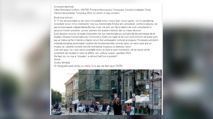 Pentru a nu-i fi retrasă autorizația de funcționare a muzeului și a teatrului cu mai puțin de o lună de 2023, Ovidiu Mihăiță a înaintat o scrisoare deschisă adresată Ministerului Culturii, UNITER, dar și Primăriei Municipiului Timișoara.