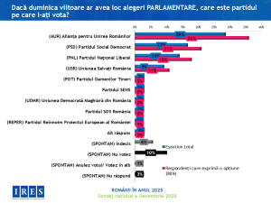 AUR ar fi pe primul loc în preferințele electorale ale românilor, dacă acum ar avea loc alegeri parlamentare, și doar patru partide ar intra în total în Legislativ, potrivit unui sondaj IRES publicat luni.