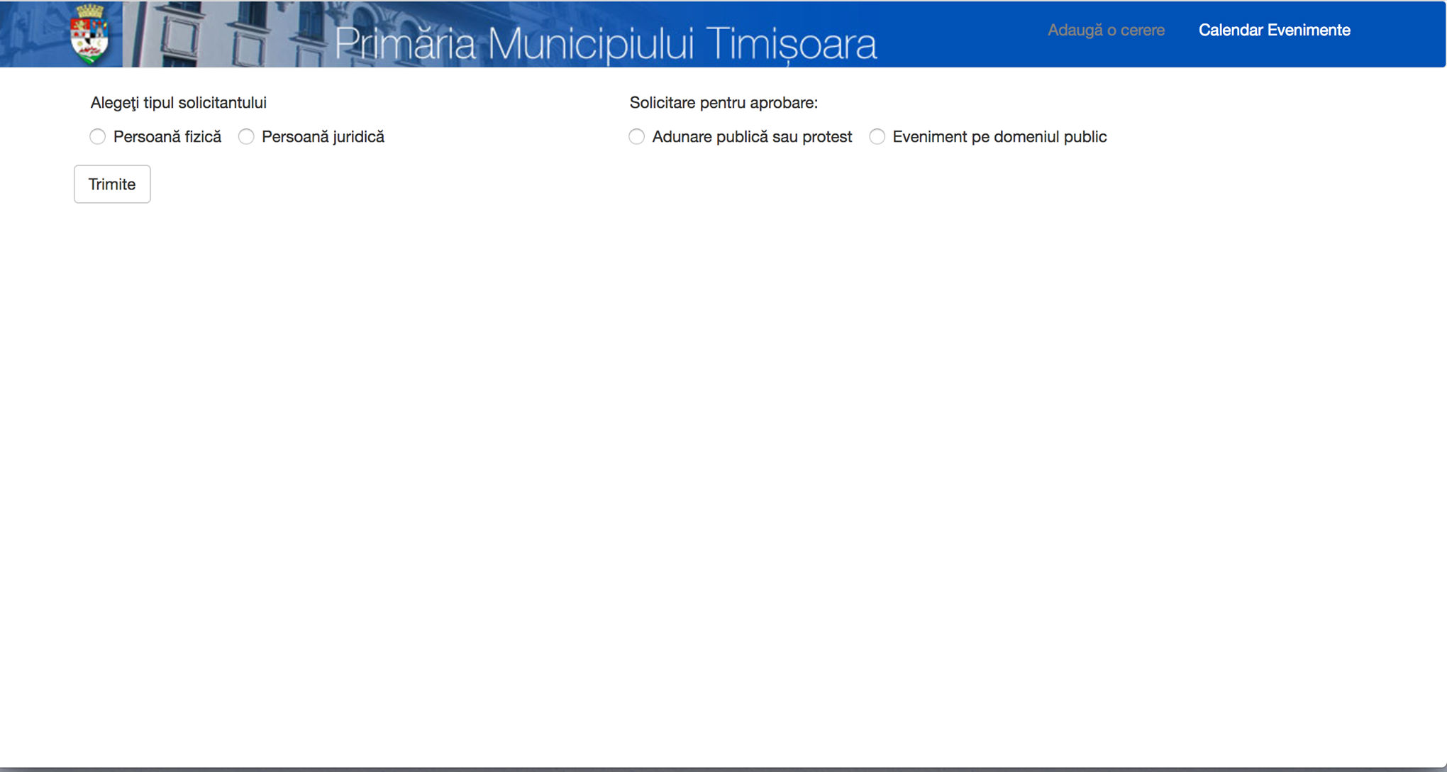 1. Se accesează formularul online disponibil pe http://www.primariatm.ro/evenimente/, se completează câmpurile obligatorii și se trimite solicitarea