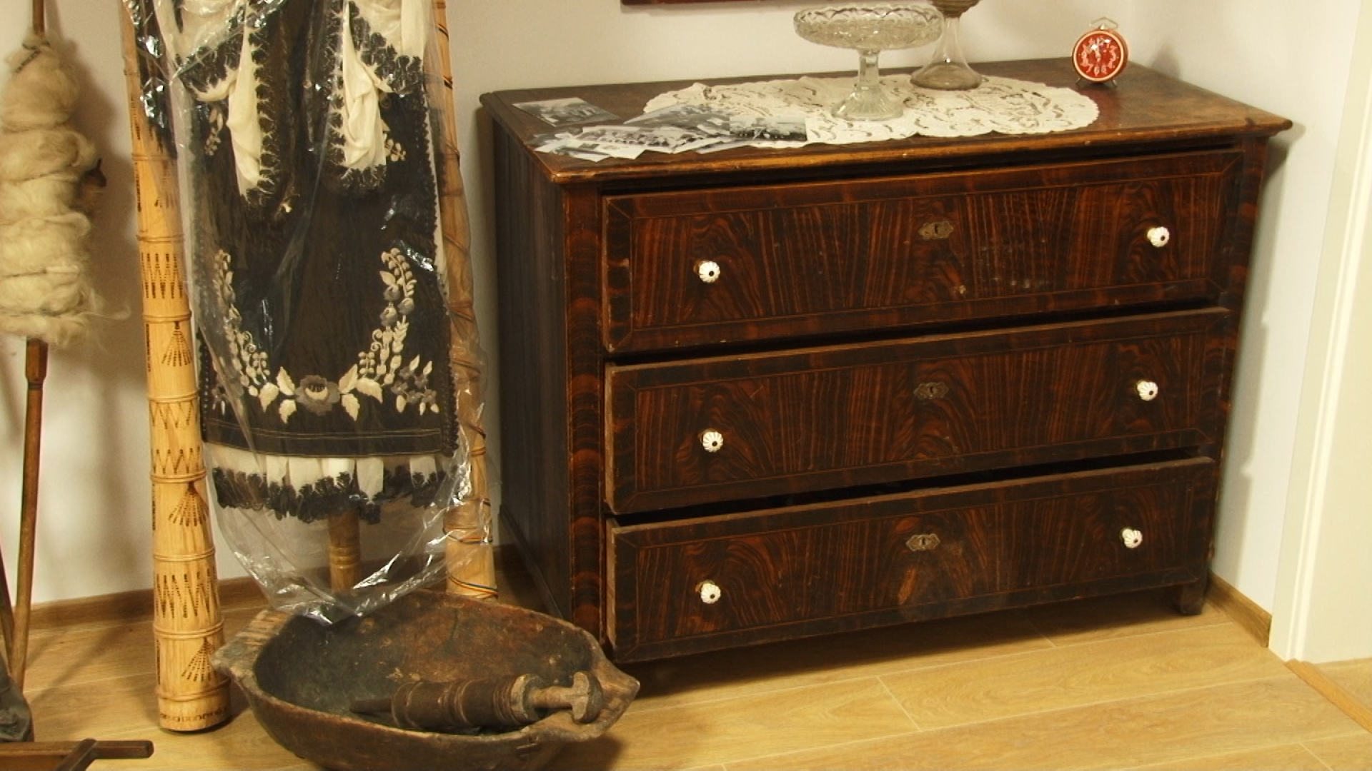 — Tot de la bunici mei a venit. Pentru că acest dormitor, pe care-l vedeți acum, este al bunicilor mei. Ar putea scrie istorie. Și eu am copilărit și am dormit aici, când eram elevă și chiar mai apoi, studentă fiind, veneam în sesiuni la bunicii de la Voiteg și învățam. Acest mobilier de dormitor a fost și în Bărăgan, la Giurgieni, pentru că bunicii mei au fost deportați. Fiind oameni foarte harnici, trebuiau să dispară de aici, dar s-au întors în vatra satului. Mobila are o istorie, nu puteam să renunț la ea. Mi-am spus: „Dacă Voitegul îl reprezint cu costume specifice, făcute de bunicii și străbunicii mei, atunci și mobila — la fel. Și celelalte zone trebuie să fie reprezentate de obiecte meșteșugărești și de mobilier specifice”. Așa am cumpărat un dormitor de la Armeniș, pe care l-am pus împreună cu costumele din zona respectivă. Un dormitor foarte vechi, cred că mai vechi decât acesta, al bunicilor mei, din comuna Almaș, județul Arad, țara Zarandului, l-am primit cadou cu cilimuri, cu prosoape, cu perini, cu absolut tot ce trebuie. Cred că familia respectivă s-a și bucurat că am scăpat-o de vechituri! Multe le-am luat pentru că oamenilor le părea rău să le arunce, nu voiau să renunțe la astfel de obiecte, dar îi incomodau în gospodărie. Și atunci am apărut noi, care am vrut să facem un muzeu, și ni le-au dăruit cu drag.