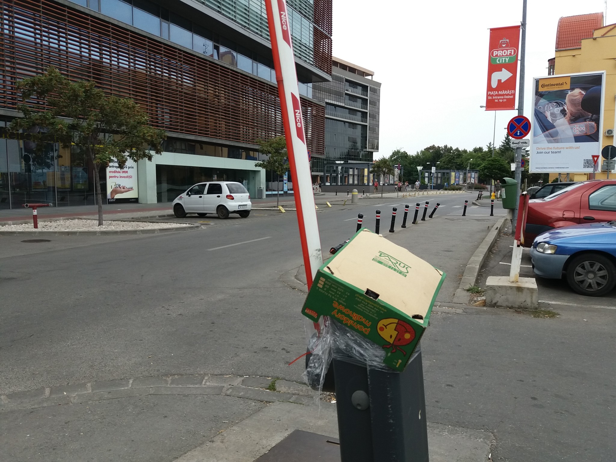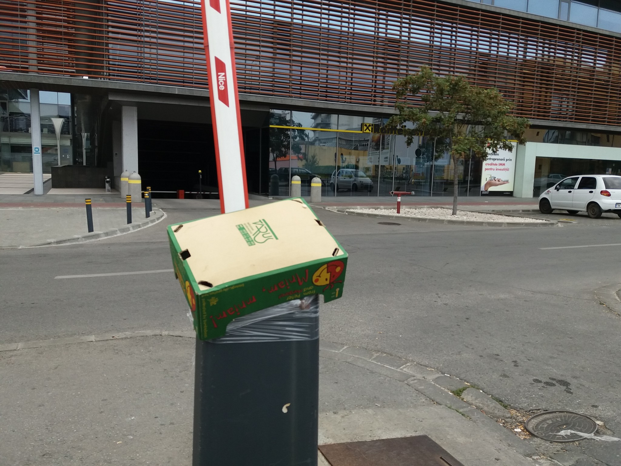 Șoferi, nu vă lăsați păcăliți de banala cutie de carton. Nu a adăpostit banane sau legume. Vine direct din marile laboratoare de IT din văile cu praf de siliciu. Știe tot: când ați făcut plinul, dacă ați umflat corect pneurile, ce note are cel mic la școală. Bariera de mucava din Piața 700 nu degeaba se află în apropierea Fiscului. Știe cu ce culoare de pix ați iscălit ultimele declarații de avere și, cel mai important, dacă din greșeală ați înjurat sitemul de parcare este consemnat în memoria hard a lăzii de carton. Dacă rezultatele vor fi pe măsura așteptărilor în curând începe și operațiunea de inlocuire a bordurilor cu cofraje de ouă.