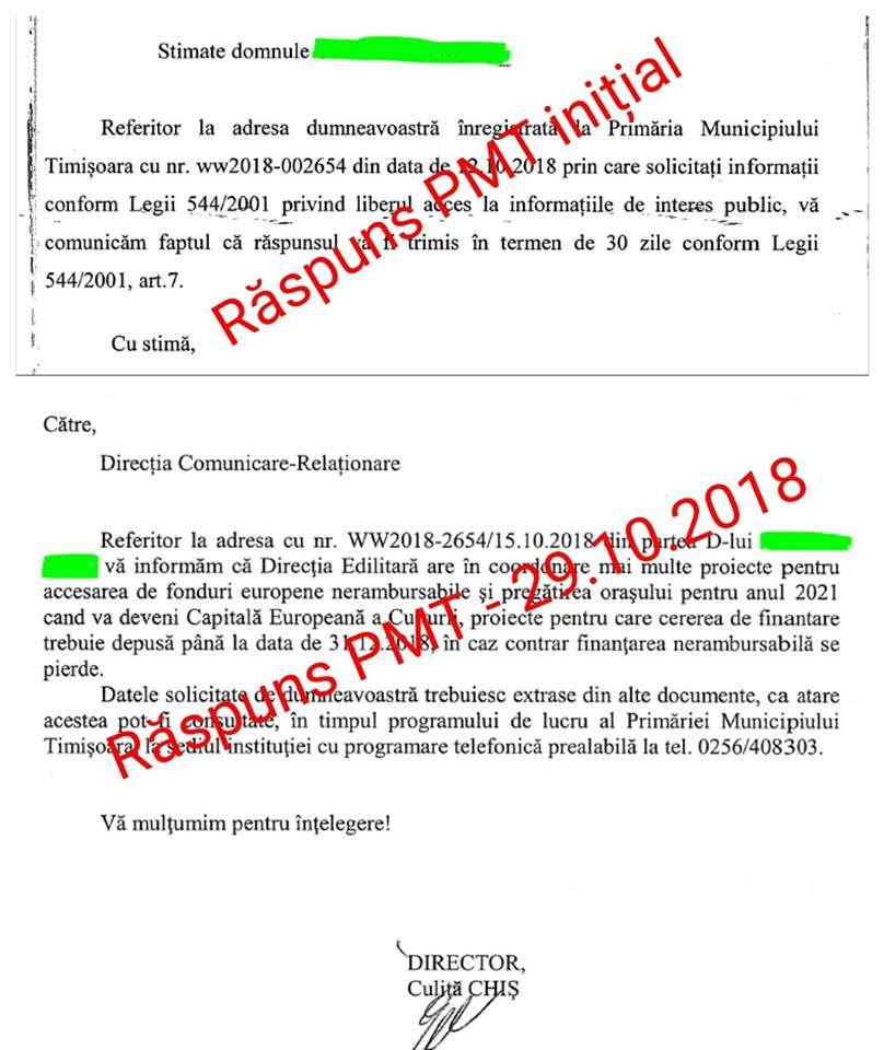 Primăria mi-a răspuns în 19 octombrie că mai are nevoie de timp – prelungind termenul de la 10 la 30 de zile, iar în 29 octombrie mi-a răspuns că-i ocupată cu proiectele pe fonduri europene, deci n-are timp să-mi răspundă la întrebări și să vin eu pe la ei să mă uit prin hârtii (pe care n-am voie să le fotografiez, fotocopiez ș.a.m.d.).