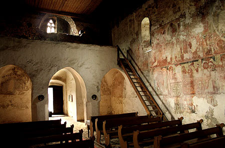 Construcţia prezintă forme arhitectonice specifice trecerii de la romanic la gotic, pereţii interiori încă mai păstrând picturile murale ale iconografiei originale.