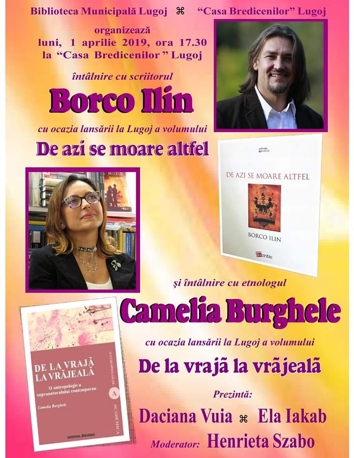 Borco Ilin – poet, prozator, jurnalist cultural, fotograf pasionat, membru al Uniunii Scriitorilor din România, Filiala Timişoara, muzeograf la Muzeul Satului Bănăţean din Timişoara, fost realizator al unor emisiuni în limba sârbă la Radio Timişoara – şi Camelia Burghele – etnolog şi cercetător ştiinţific la Muzeul Judeţean de Istorie şi Artă Zalău – vor veni, pentru prima dată, la Lugoj, cu o dublă lansare de carte: cu volumul de poezie “De azi se moare altfel” – Editura Diacritic, Colecţia Poezie, Timişoara, 2016, semnat de Borco Ilin, şi cartea “De la vrajă la vrăjeală – O antropologie a supranaturalului contemporan” – Editura Institutului European, Colecţia Antropologie Academică, Iaşi, 2017, semnată de Camelia Burghele.