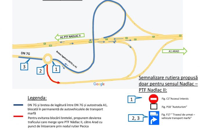 „Pentru a elimina disconfortul creat de blocajul format de transportatorii de marfă pe DN 7G şi breteaua de acces pe autostrada A1, autovehiculele de transport marfă nu vor mai putea folosi breteaua de acces spre A1 de la km 582+666 al autostrăzii, pe sensul Nădlac – PTF Nădlac 2, fiind direcţionate din sensul giratoriu de pe DN 7G km 6+667, pe autostrada A1 către Arad. Autovehiculele de transport marfă trebuie să se întoarcă spre PTF Nădlac 2 prin nodul rutier Pecica de pe A1 km 558+618, intrând în traficul normal de pe autostradă”, se arată într-un comunicat transmis, luni, de DRDP Timişoara.