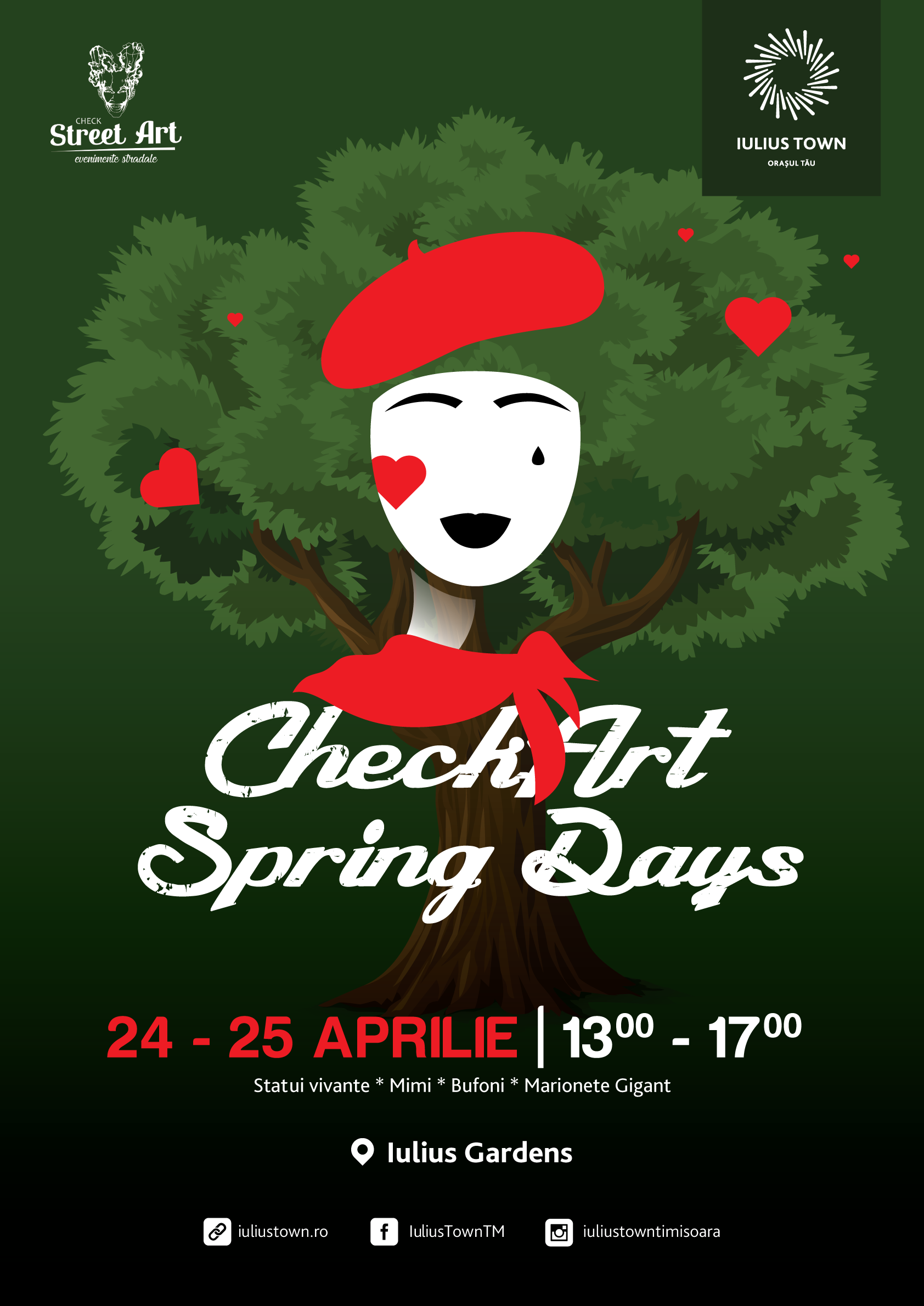 Arta, sub multe forme inedite, va anima Iulius Gardens, în acest weekend. Check Art Spring Days aduce razele soarelui de primăvară în inima verde a Iulius Town, cu ajutorul statuilor vivante, mimilor, bufonilor și marionetelor gigant. Vino să vezi cum se împletesc arta, natura și buna dispoziție!