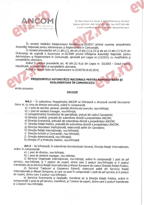 „În temeiul Legii nr.544 din 2001 privind liberul acces la informațiile de interes public, vă rugăm să ne comunicați următoarele: Prin Decizia președintelui ANCOM 649/18.06.2019, pe care nu am găsit-o pe site-ul instituției dumneavoastră, în organigramă apar 71 posturi în plus față de organigrama precedentă, din care 5 de conducere.