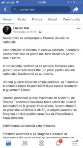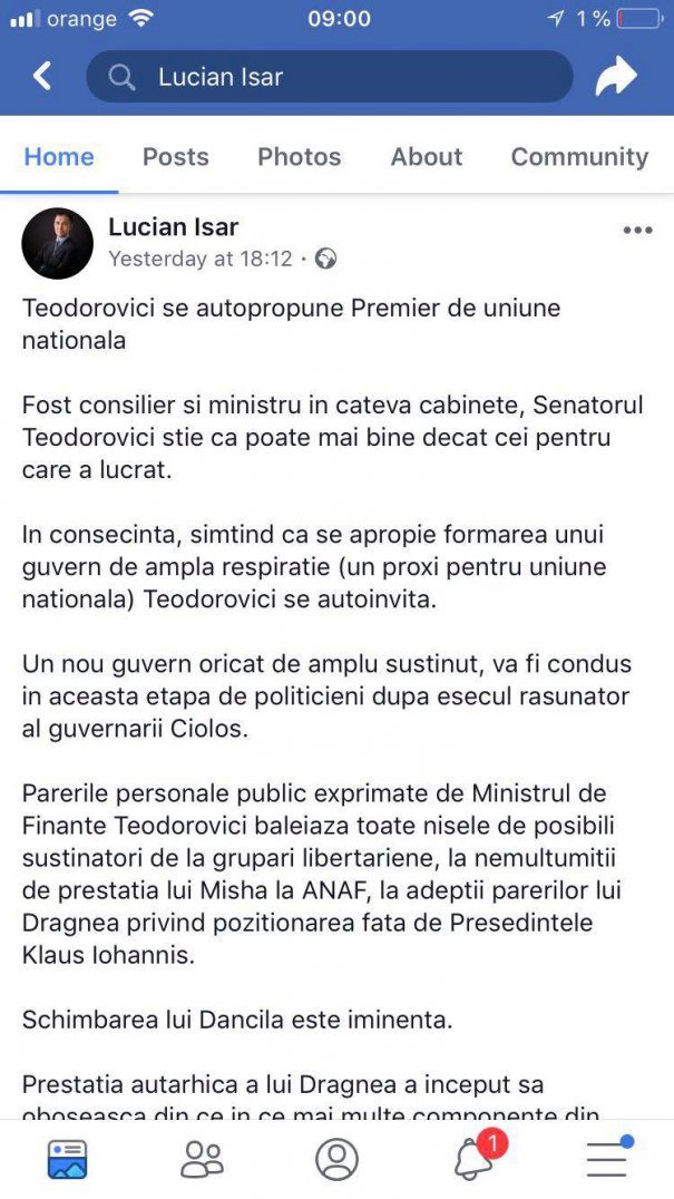 Teodorovici se autopropune Premier de uniune nationala. In consecinta, simtind ca se apropie formarea unui guvern de ampla respiratie (un proxi pentru uniune nationala) Teodorovici se autoinvita, scrie scrie liberalul Lucian Isar, sotul Alinei Gorghiu, intr-un textul publicat pe Facebook.