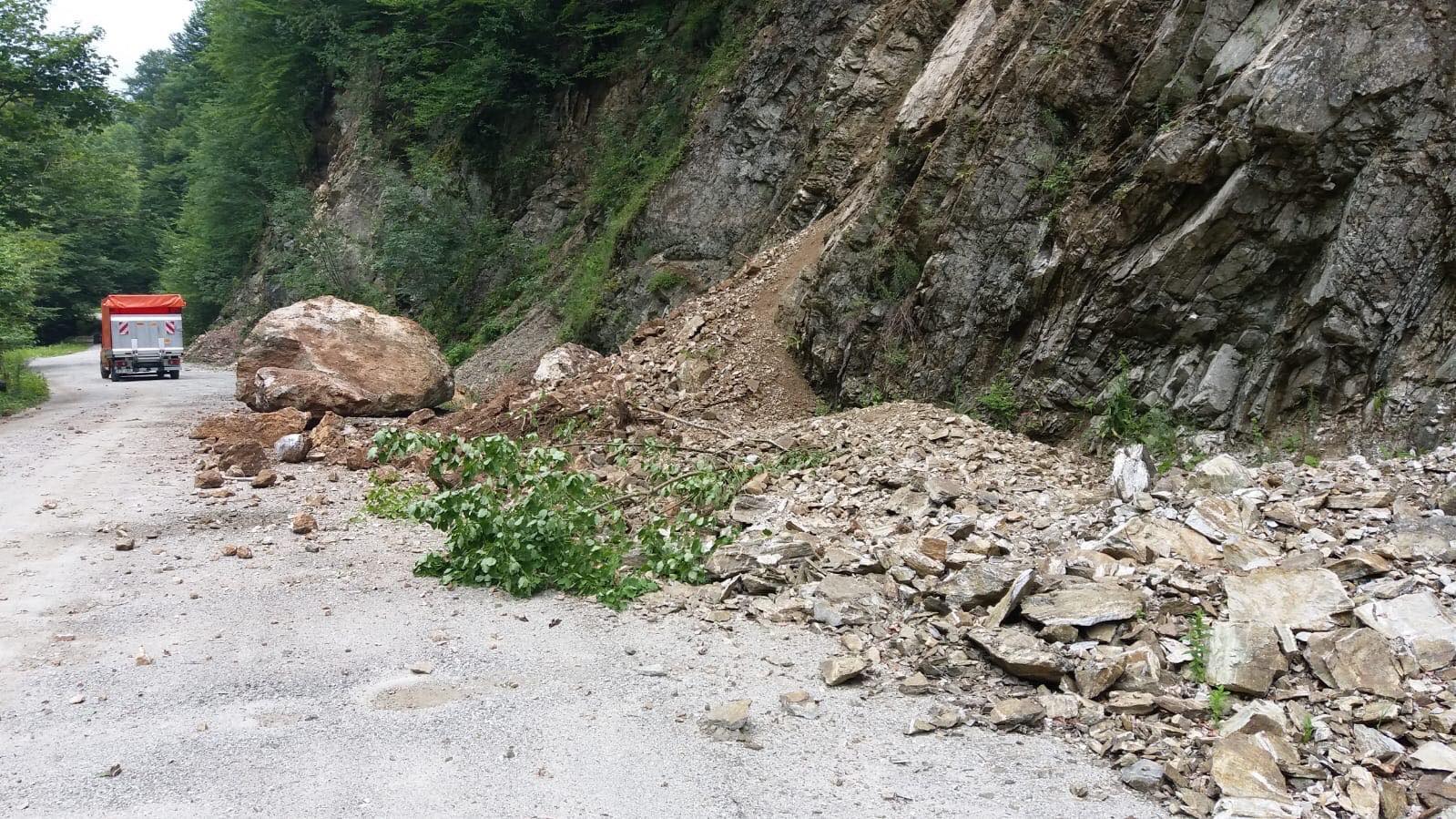 Probleme pentru autoritățile din Caraș-Severin. Jumătate din drumul național 66A este blocat din cauza unor bolovani care au căzut pe drum.