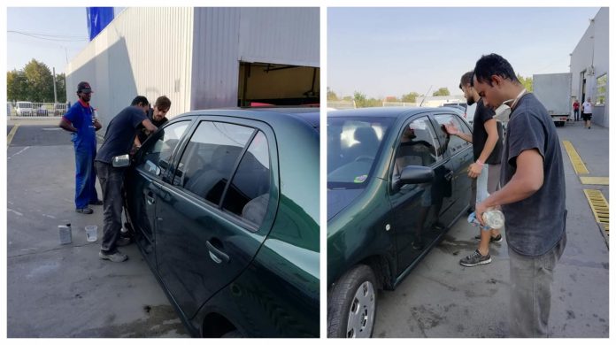 Întâmplare de tot hazul, la un service auto din municipiul Arad. O femeie care s-a dus să-și scoată mașina de la reparații s-a trezit cu parbrizul vopsit odată cu autovehiculul!