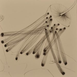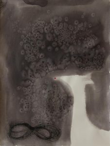 A.A.: Amândouă, am nevoie de ele în egală măsură. Temele vin din mintea mea, dar și din ceva mai mult: corpul, în toată materialitatea lui, chiar grosieră, fiziologia, emoțiile, sentimentele, credințele, istoria mea, drumurile mele… Inspirația este complementarul celor planificate, nu e opusul. Sunt disciplinată și îmi face bine să lucrez ritmic, după un program. Inspirația cred că este tot timpul în mine, trebuie doar să-i acord atenție. Se simte luată în serios atunci când are un context material ca să poată lua o formă. De exemplu, un spațiu curat și suficient de mare ca să așez hârtiile. Le iubesc. Sunt atașată de ele și are mare importanță pentru mine calitatea lor. Atunci când contează rafinamentele limbajului plastic și am ajuns să dezvolt relații sentimentale cu liniile sau cu hârtiile., Eeste important și cum mă organizez ca să am anumite pensule (unelte?) care mă vor ajuta să creez liniile pe care le doresc, contează și cerneala pe care o folosesc. Mai exact, cu care colaborez. Mă inspiră puterea. Depinde de noi ce facem cum o folosim.