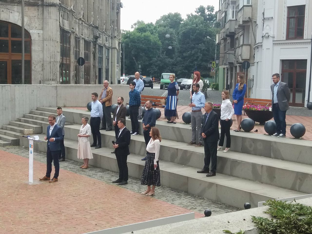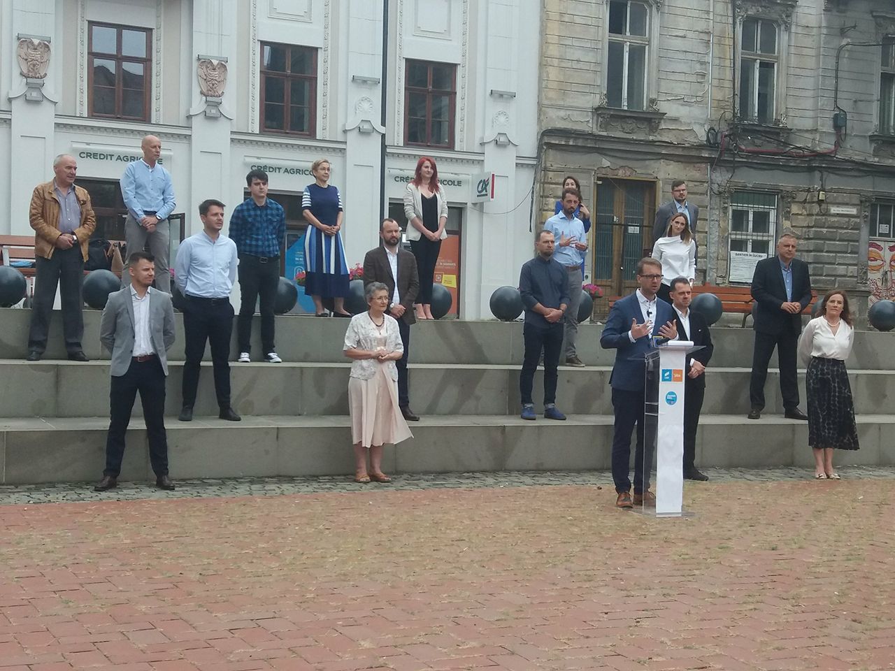 Dar pentru o mai bună vizibilitate toți cei 17 candidați dornici să ajungă consilieri locali au fost azi aliniați, ca pe scenă, pe treptele pieței Sfântul Gheorghe. În ciuda aplecării spre muzica de cor a liderului Fritz, nu au abordat o partitură lirică ci au fost prezentați cât se poate de epic cu date din biografiile lor și câteva puncte forte pe care se vor apleca dacă vor conduce orașul. În opinia candidatului de primar toți colegii săi sunt de o înaltă probitate profesională.