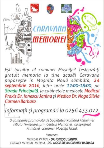 Acum a venit rândul locuitorilor din Moșnița Nouă. Caravana va poposi în zilele de 24 și 25 septembrie în comuna Moșnița Nouă, unde echipa de specialiști va testa gratuit memoria doritorilor, în vederea depistării precoce a deficitului cognitiv sau al tulburărilor de memorie.