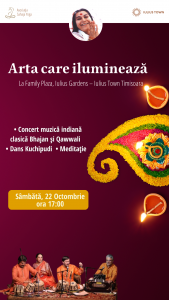 Experimentează arta ca mijloc de dezvoltare spirituală! Aceasta este invitaţia adresată de centrul Meditaţia Sahaja Yoga din Timişoara, în zona Family Plaza din Iulius Gardens, acolo unde sâmbătă, de la ora 17:00, va avea loc spectacolul „Arta care iluminează”. Muzica indiană clasică Bhajan si Qawwali şi momentele de dans Kuchipudi (spectacol de dans-dramă clasic indian) se vor împleti cu sesiunile de meditaţii, transformând timpul petrecut în aer liber într-o relaxare totală.