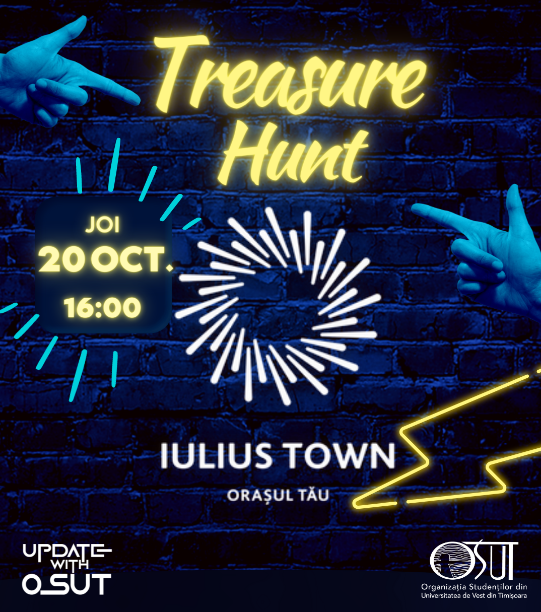 Iulius Town a acceptat provocarea Treasure Hunt, o inițiativă a Organizaţiei Studenţilor din Universitatea de Vest din Timişoara (OSUT). Joi, 20 octombrie 2022, de la ora 16:00, 6 echipe de studenți vor intra într-o cursă plină de entuziasm, în încercarea de a ajunge la cele mai multe checkpoint-uri, în cel mai scurt timp. La final, după ce câştigătorii se vor bucura de premiile oferite, OSUT Band va crea o atmoferă unică, pe care să o ții minte toată studenția.