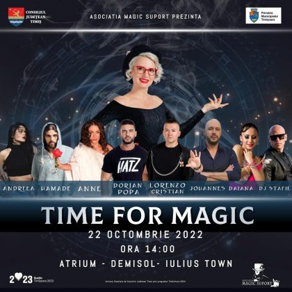 Sâmbătă, 22 octombrie, poți călători în jurul lumii, dar poți fi, mai ales, parte a unei expediţii de-a lungul unor universuri captivante, în lumea magiei și a curajului de a depăși limite. Astfel, în intervalul orar 14:00- 19:00, te invităm la evenimentul care dă startul festivalului „Time For Magic”. Vino în Iulius Mall, în zona Atrium, unde invitați speciali te vor impresiona cu numere de magie, într-o alăturare fascinantă de muzică, improvizație, efervescență și emoție. Dorian Popa va levita într-un număr spectaculos pus în scenă de magicianul Lorenzo-Cristian, iar iluzionistul Johannes va aduce numere de senzație, chiar sub ochii tăi.